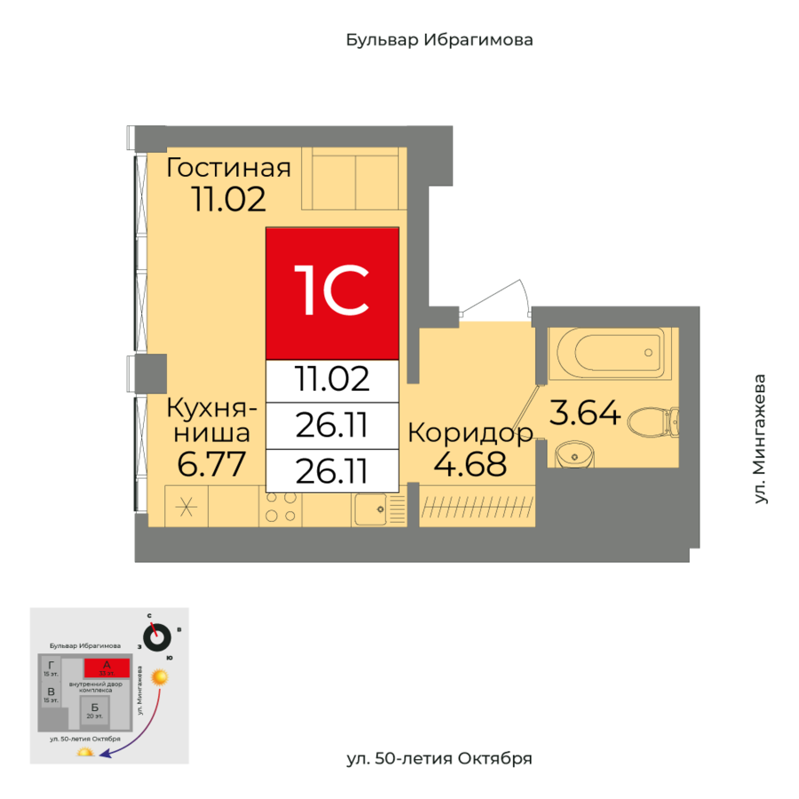 Купить однокомнатную квартиру 26.11м², №384 в Grand&Grand г. Уфа