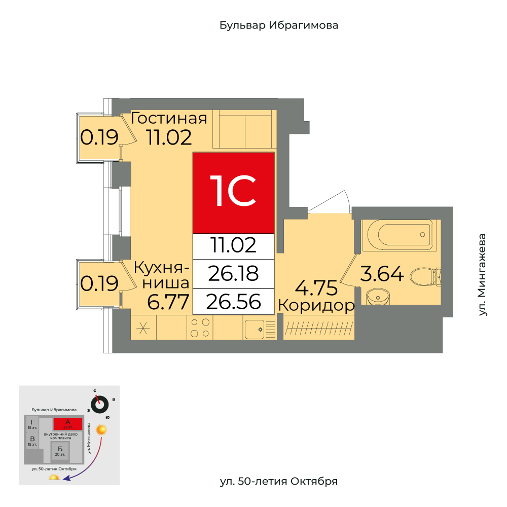 Купить однокомнатную квартиру 26.56м², №398 в Grand&Grand г. Уфа