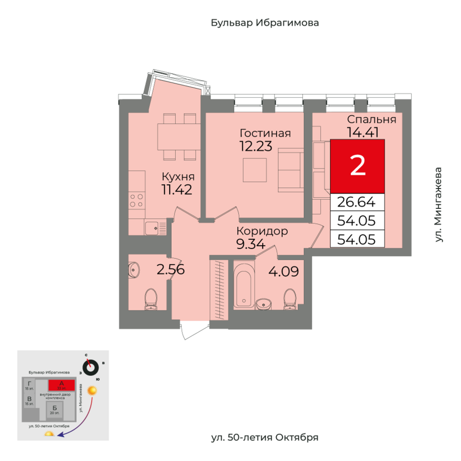 Купить двухкомнатную квартиру 54.05м², №496 в Grand&Grand г. Уфа