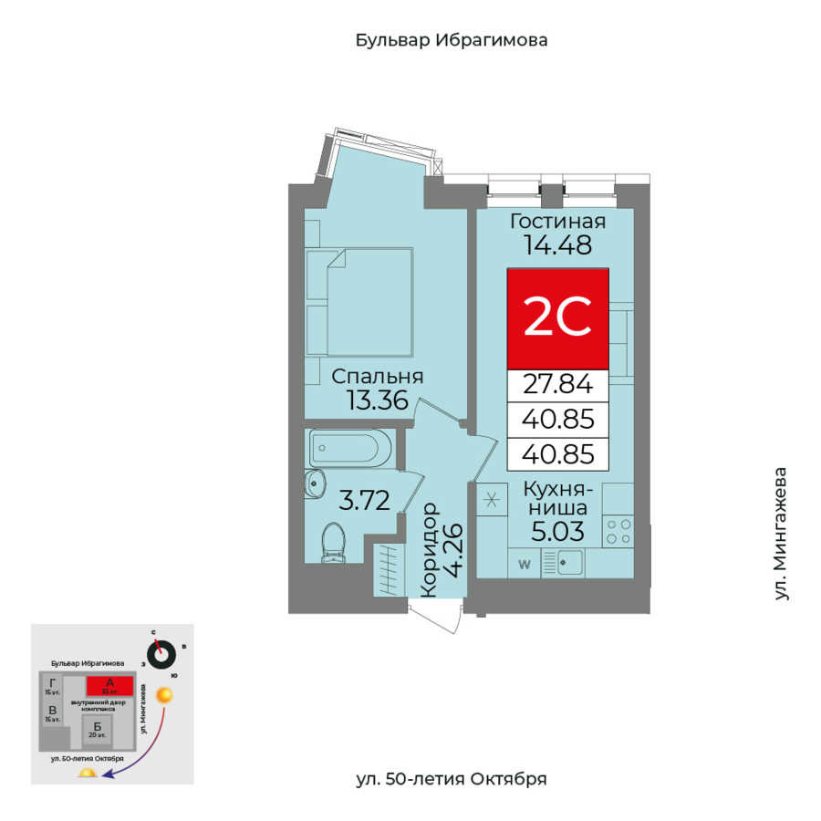 Купить двухкомнатную квартиру 40.85м², №578 в Grand&Grand г. Уфа