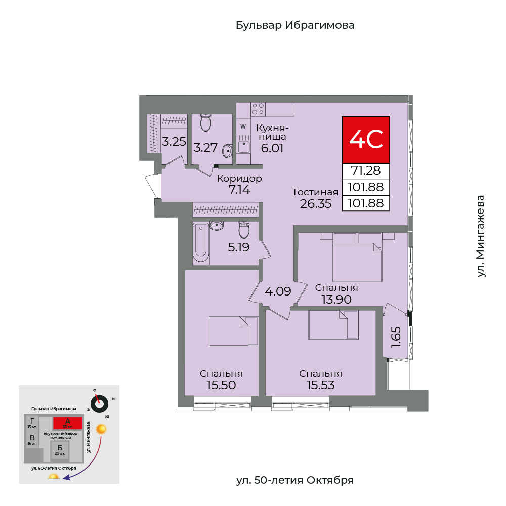 Купить четырехкомнатную квартиру 101.88м², №651 в Grand&Grand г. Уфа
