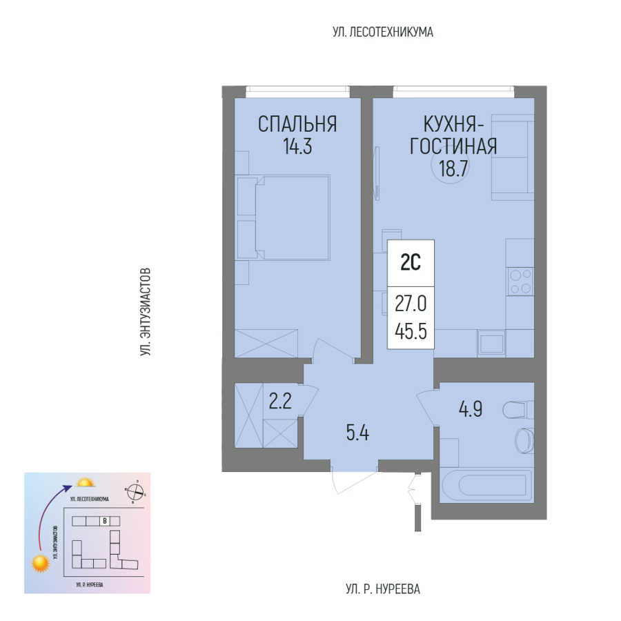 Купить двухкомнатную квартиру 45.5м², №258 в Новатор г. Уфа