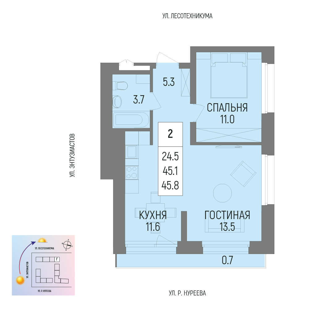 Купить двухкомнатную квартиру 45.8м², №388 в Новатор г. Уфа