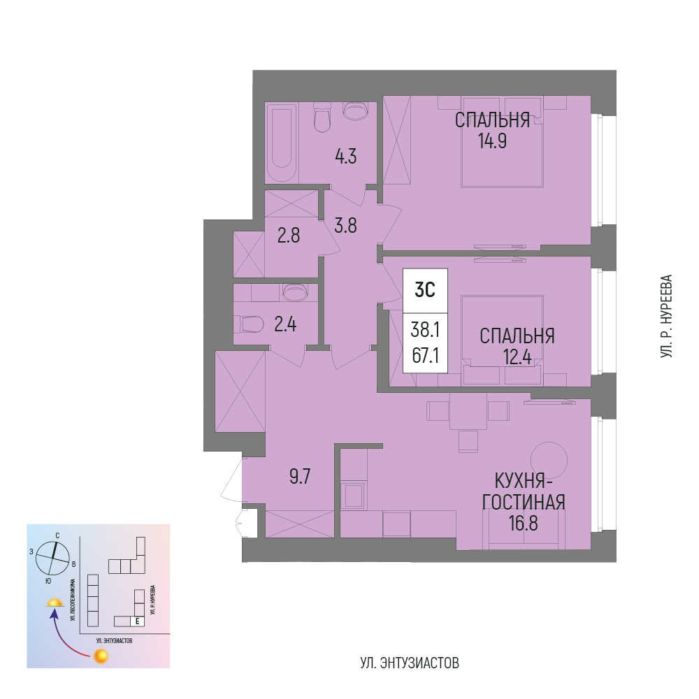 Купить трехкомнатную квартиру 67.1м², №579 в Новатор г. Уфа