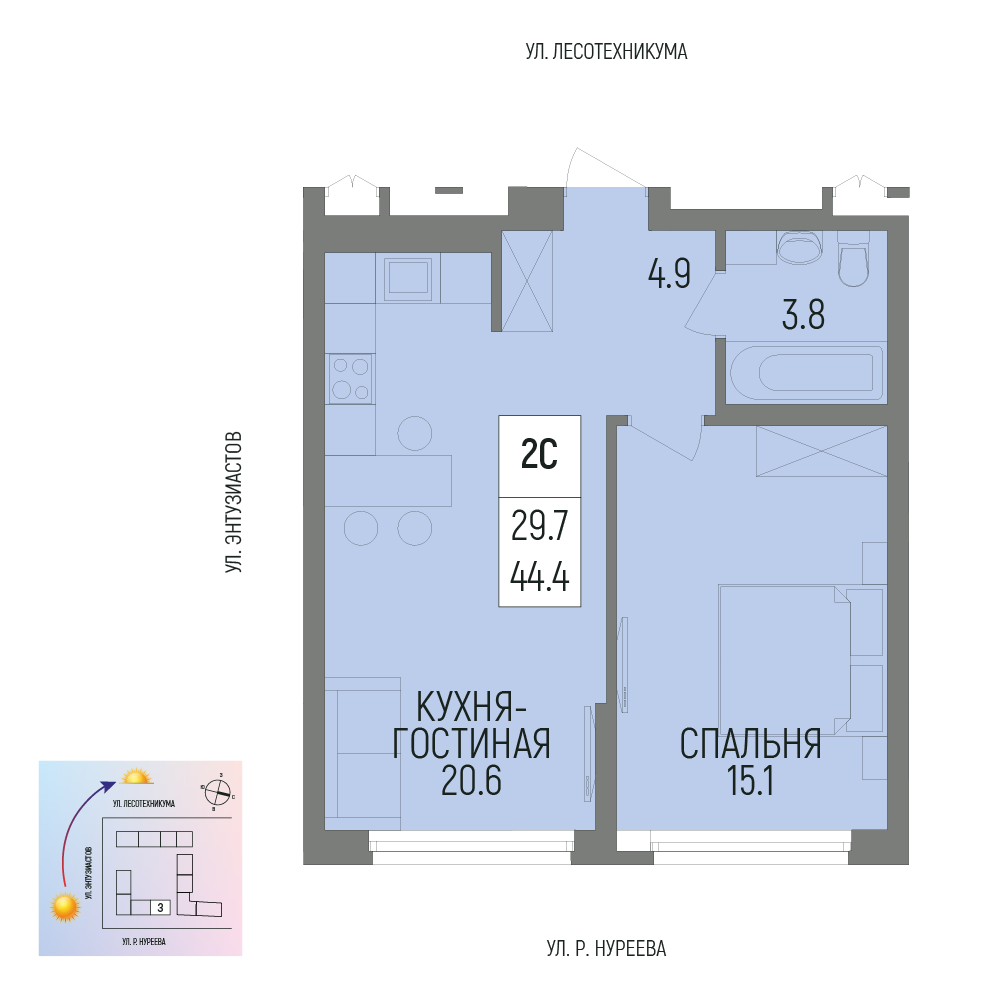 Купить двухкомнатную квартиру 44.4м², №661 в Новатор г. Уфа