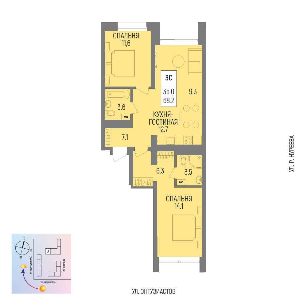 Купить трехкомнатную квартиру 68.2м², №37 в Новатор г. Уфа