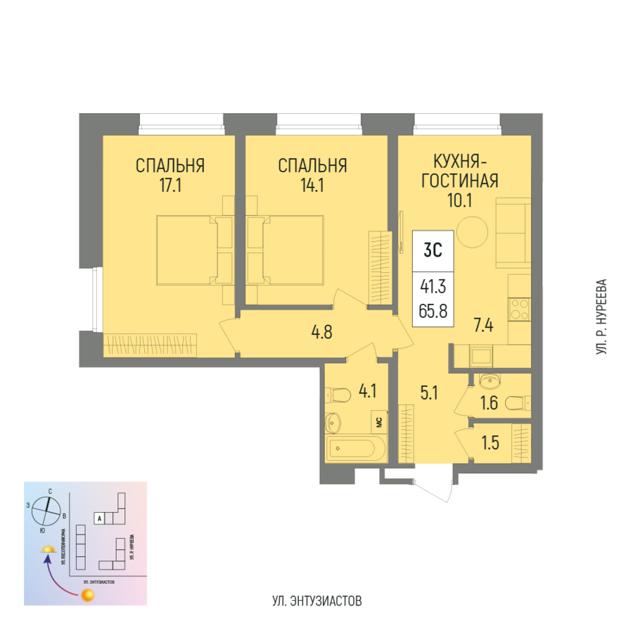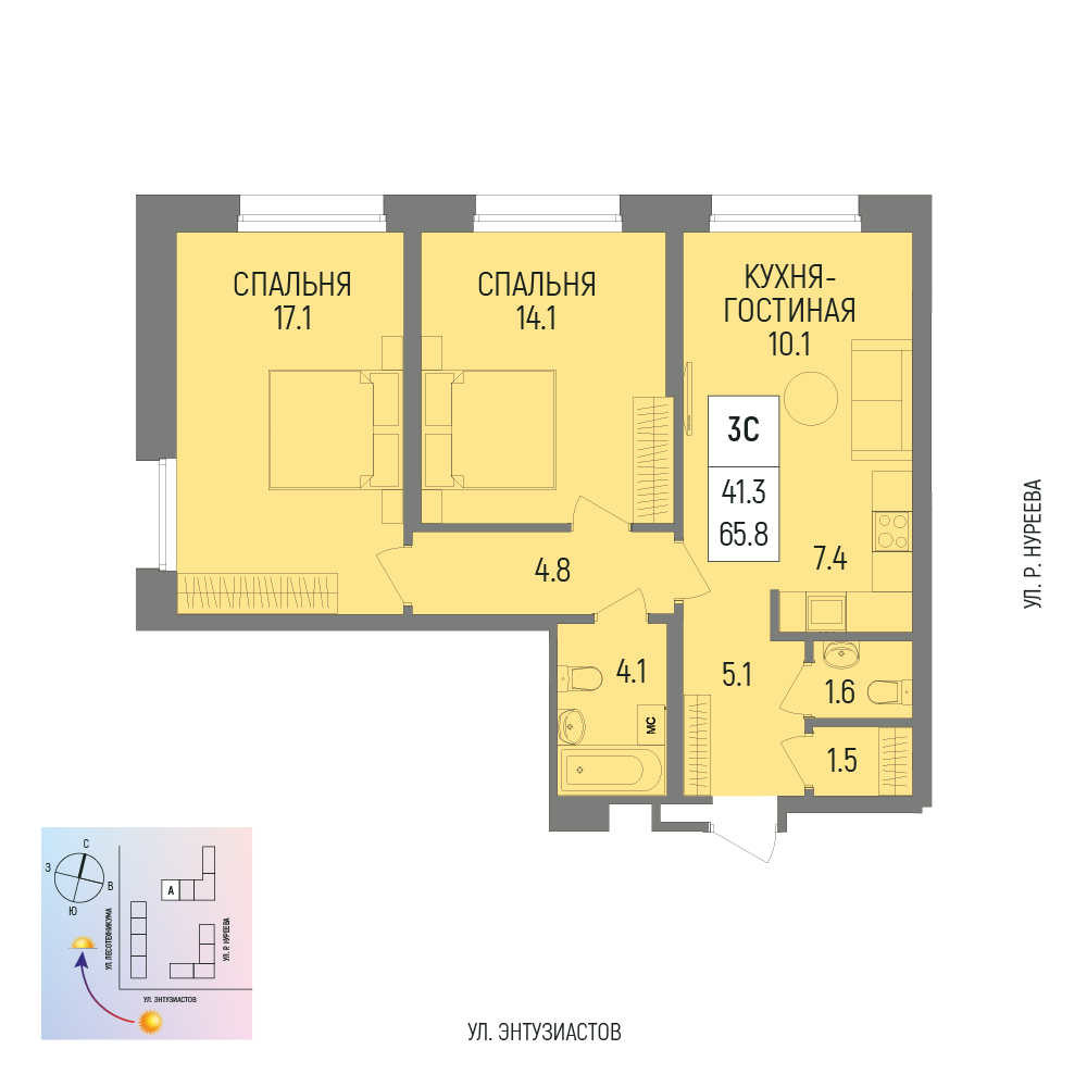 Купить трехкомнатную квартиру 65.8м², №64 в Новатор г. Уфа