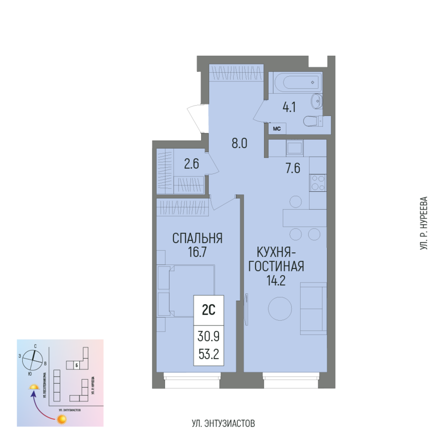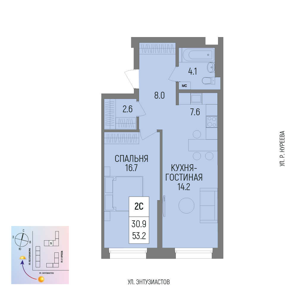 Купить двухкомнатную квартиру 53.2м², №133 в Новатор г. Уфа