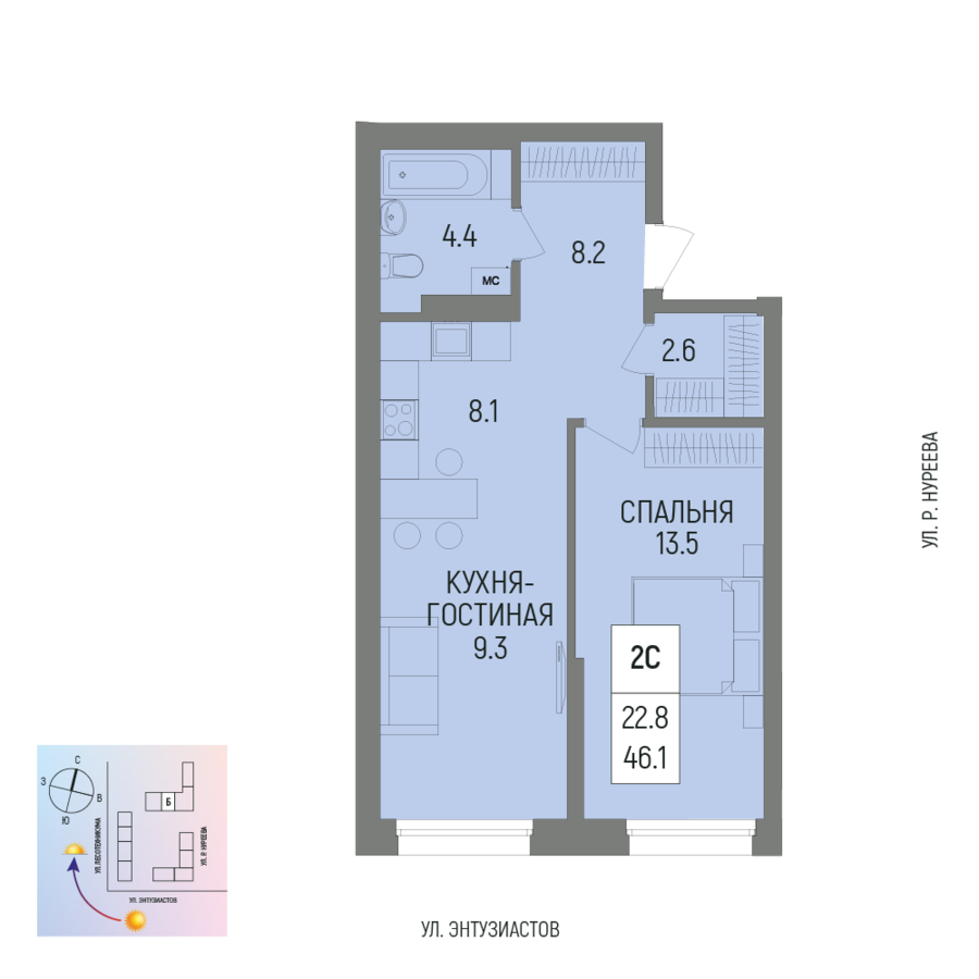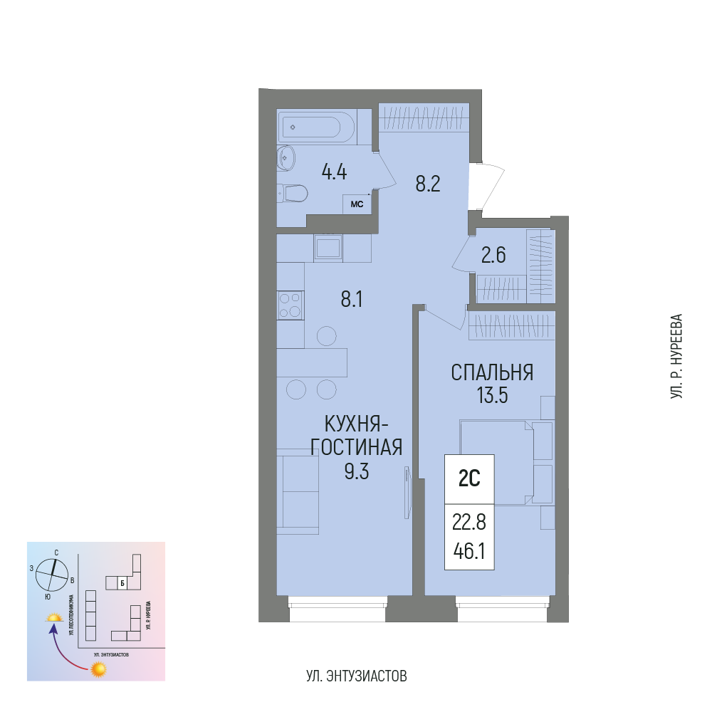 Купить двухкомнатную квартиру 46.1м², №186 в Новатор г. Уфа