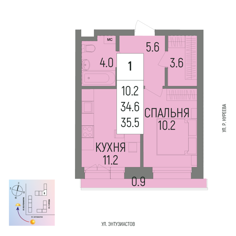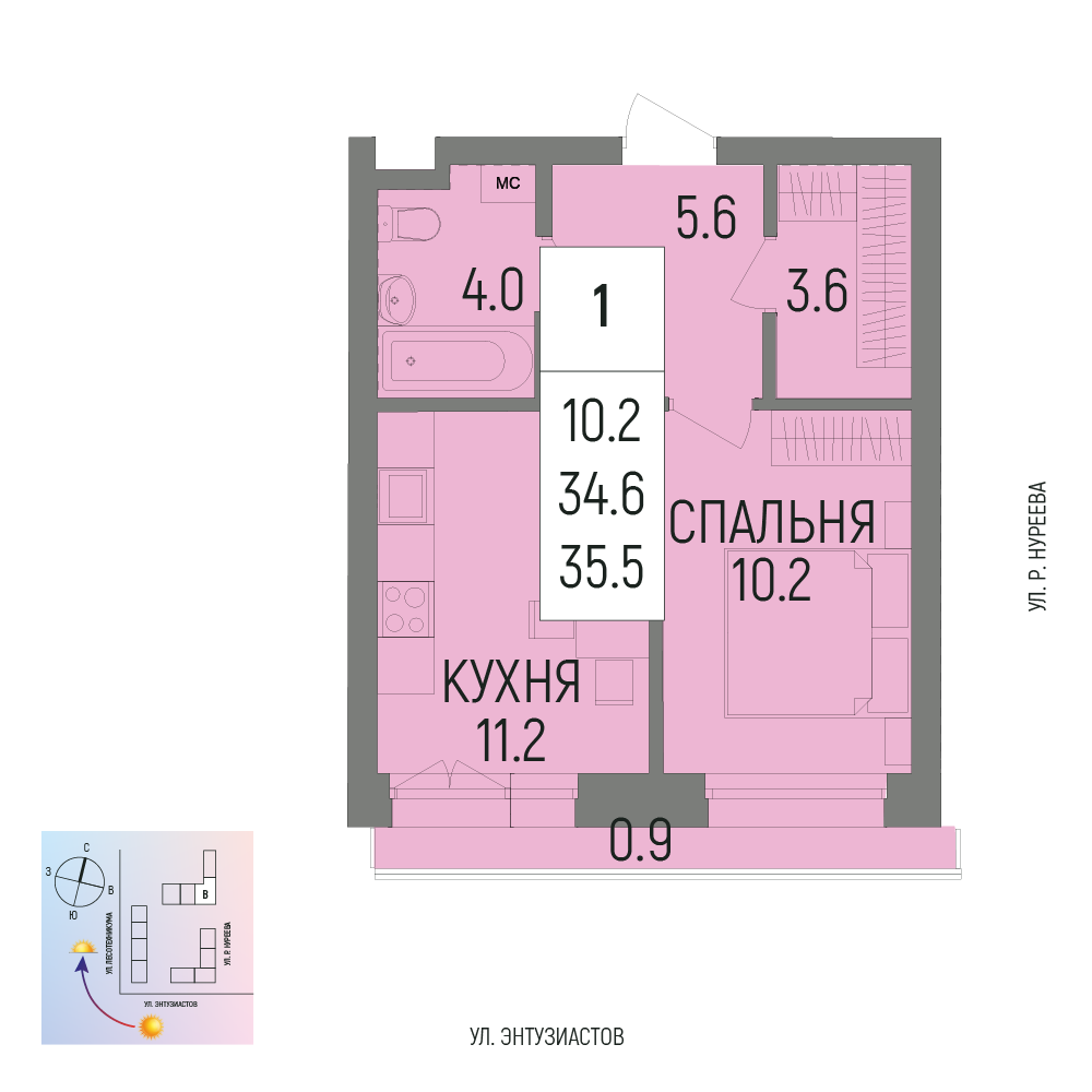 Купить однокомнатную квартиру 35.5м², №201 в Новатор г. Уфа
