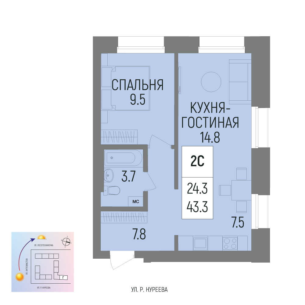Купить двухкомнатную квартиру 43.3м², №344 в Новатор г. Уфа
