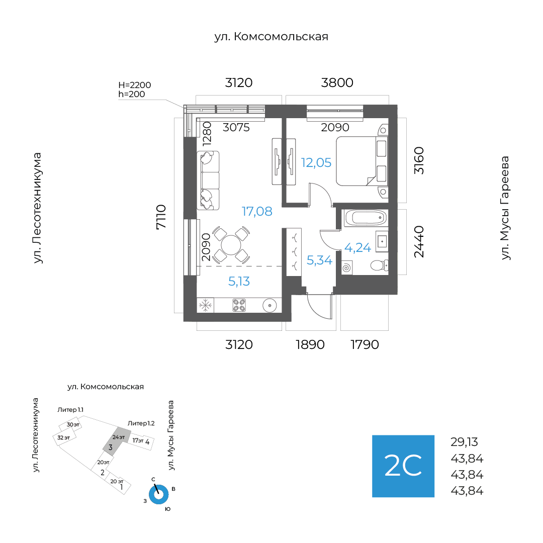 43.84 м²