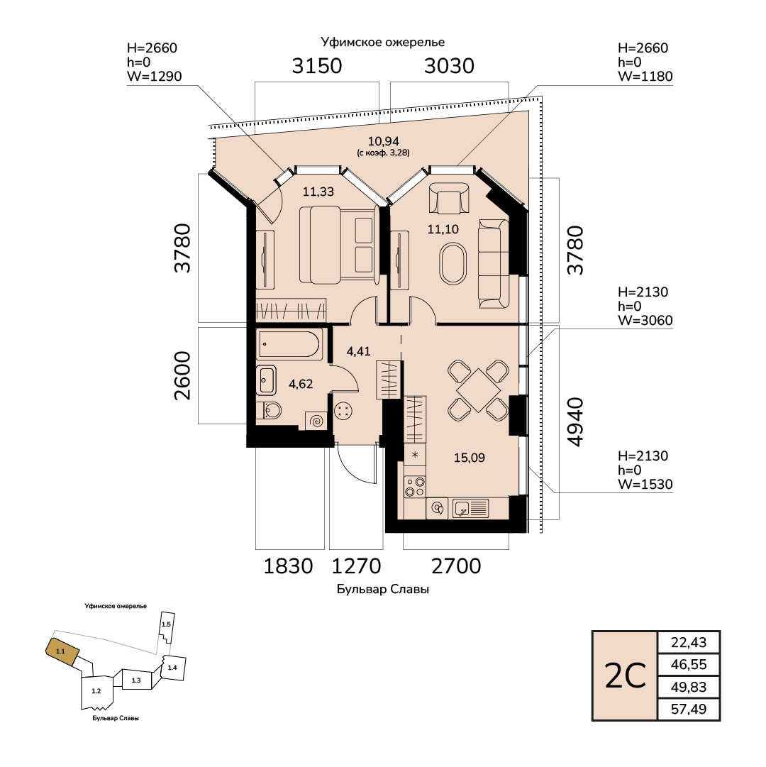 15.09 м²